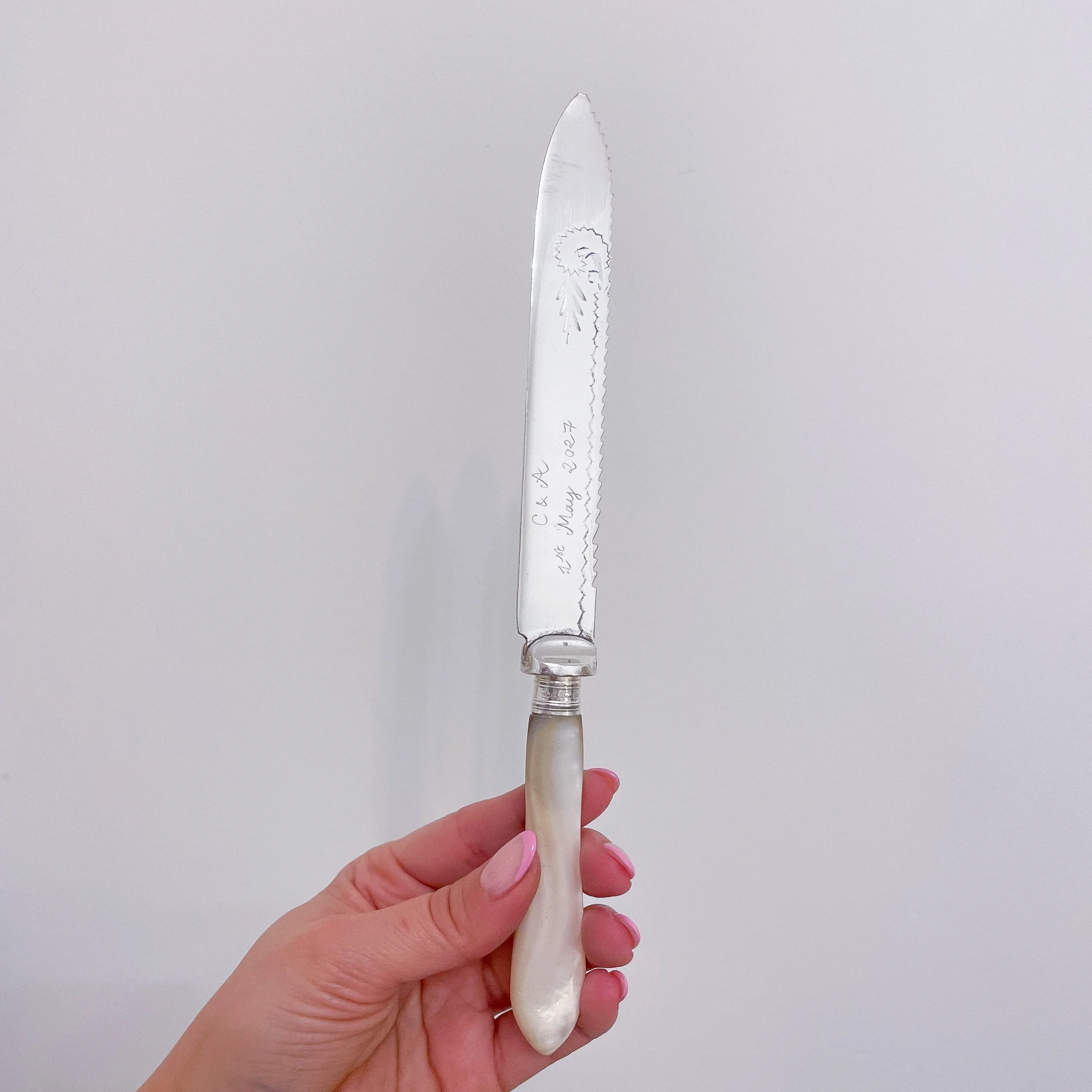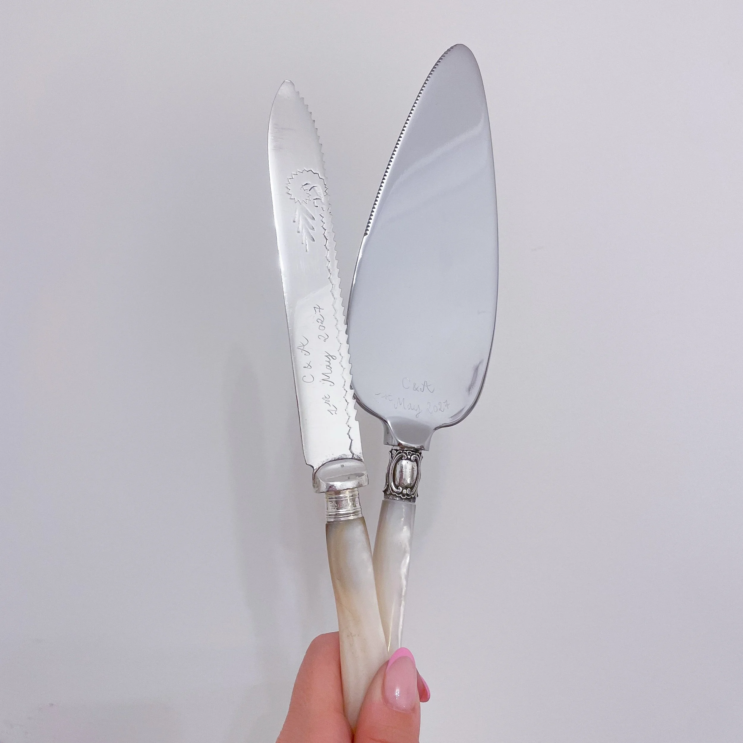 All our cutlery is vintage and has been carefully hand-picked & sourced in vintage and antique markets across the UK. All pieces will have some floral details, usually on the handle. They are all engraved by hand in my signature French cursive handwriting on the surface of the piece.